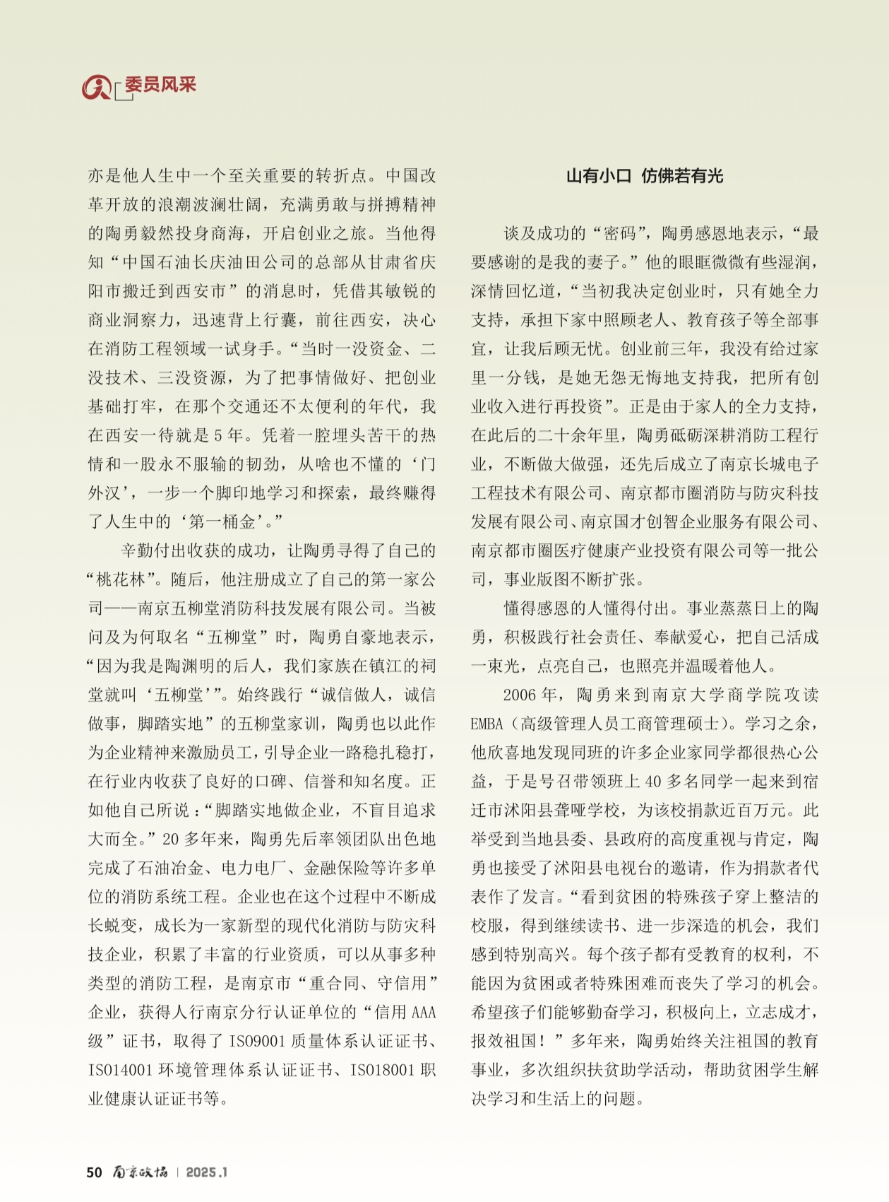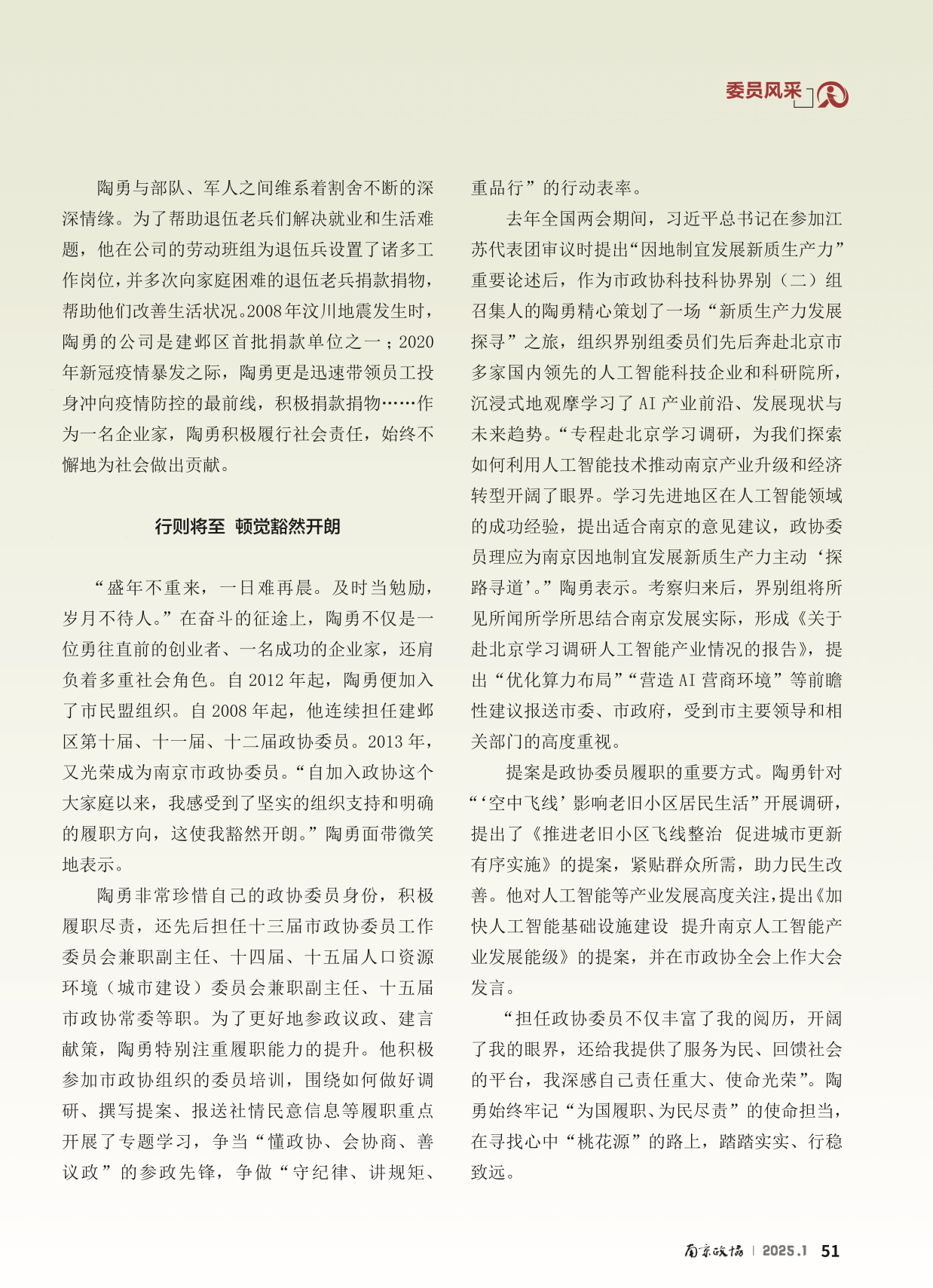 ?他曾是一名投身军营逐梦的热血青年,也是一位积极响应国家号召,勇闯商海的时代先锋,更是一位拥有超过20年市、区政协履职经历的资深委员……陶勇表示,“身份和岗位或许会变,但军人的作风和品质在我身上始终如一,从未改变?!?/p>